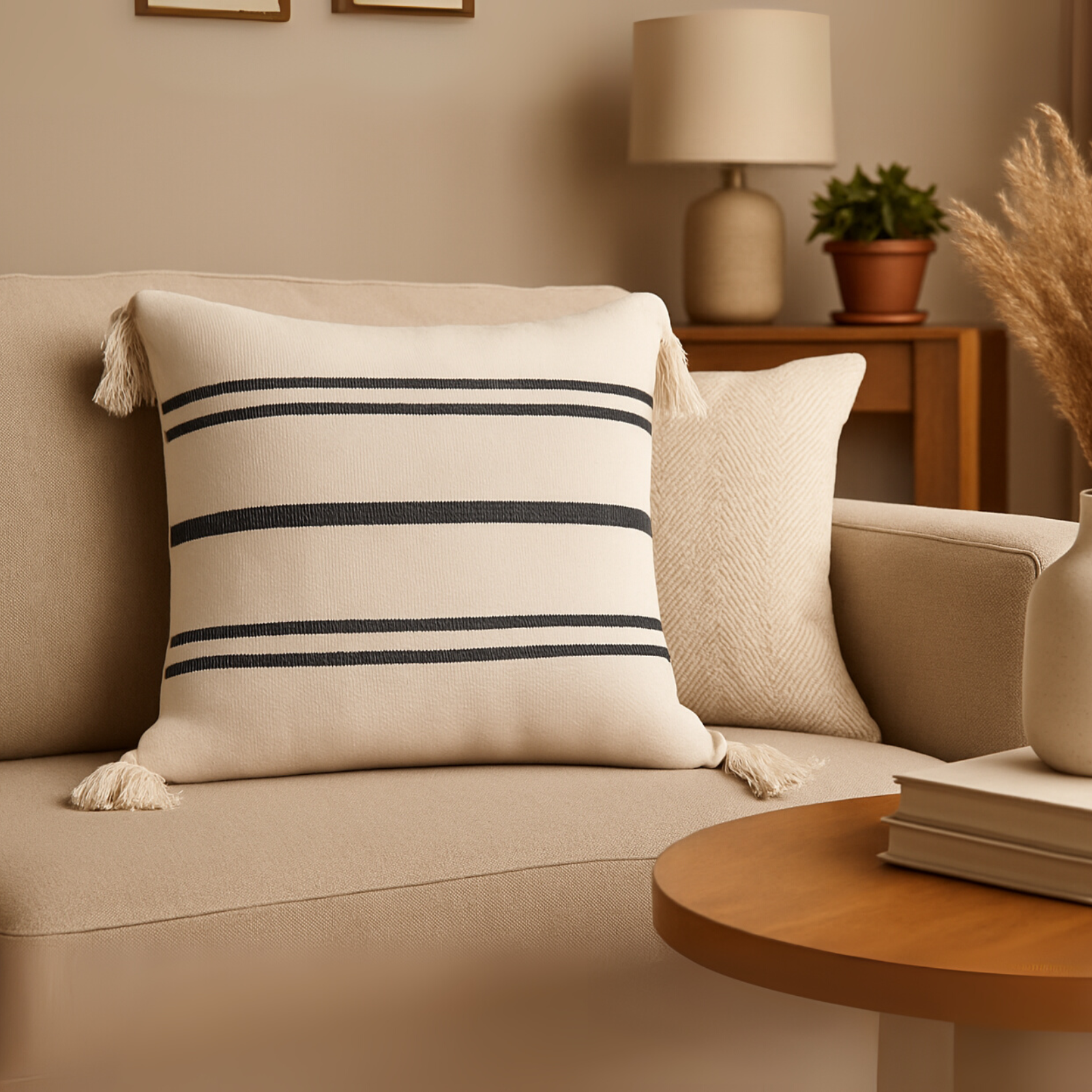 - Detalles con borlas: Los cojines están decorados con delicadas borlas en las esquinas, añadiendo un toque artesanal que resalta su estilo bohemio.