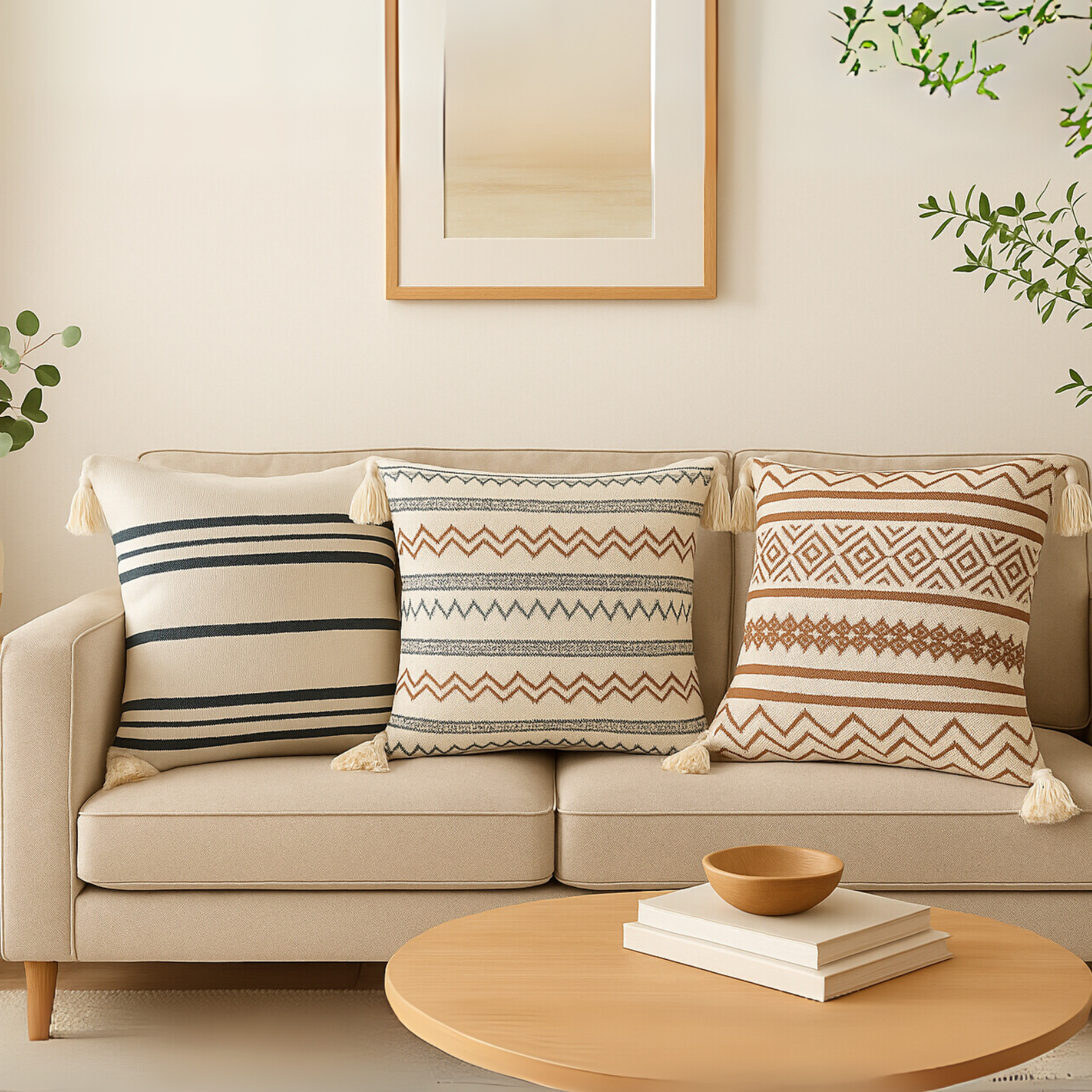 - Diseño boho chic: Cada cojín presenta un exclusivo patrón en tonos neutros y terrosos que se adapta fácilmente a decoraciones bohemias, nórdicas o modernas.
