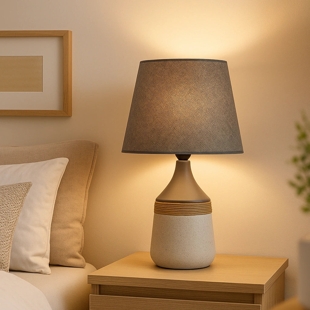 Renueva tu espacio con esta lámpara de noche que combina a la perfección lo rústico y lo moderno. Su base de cerámica robusta, envuelta con un elegante toque de cuerda natural, le da un estilo único que aporta calidez y personalidad a cualquier ambiente, ya sea en tu oficina, sala de estar o dormitorio.