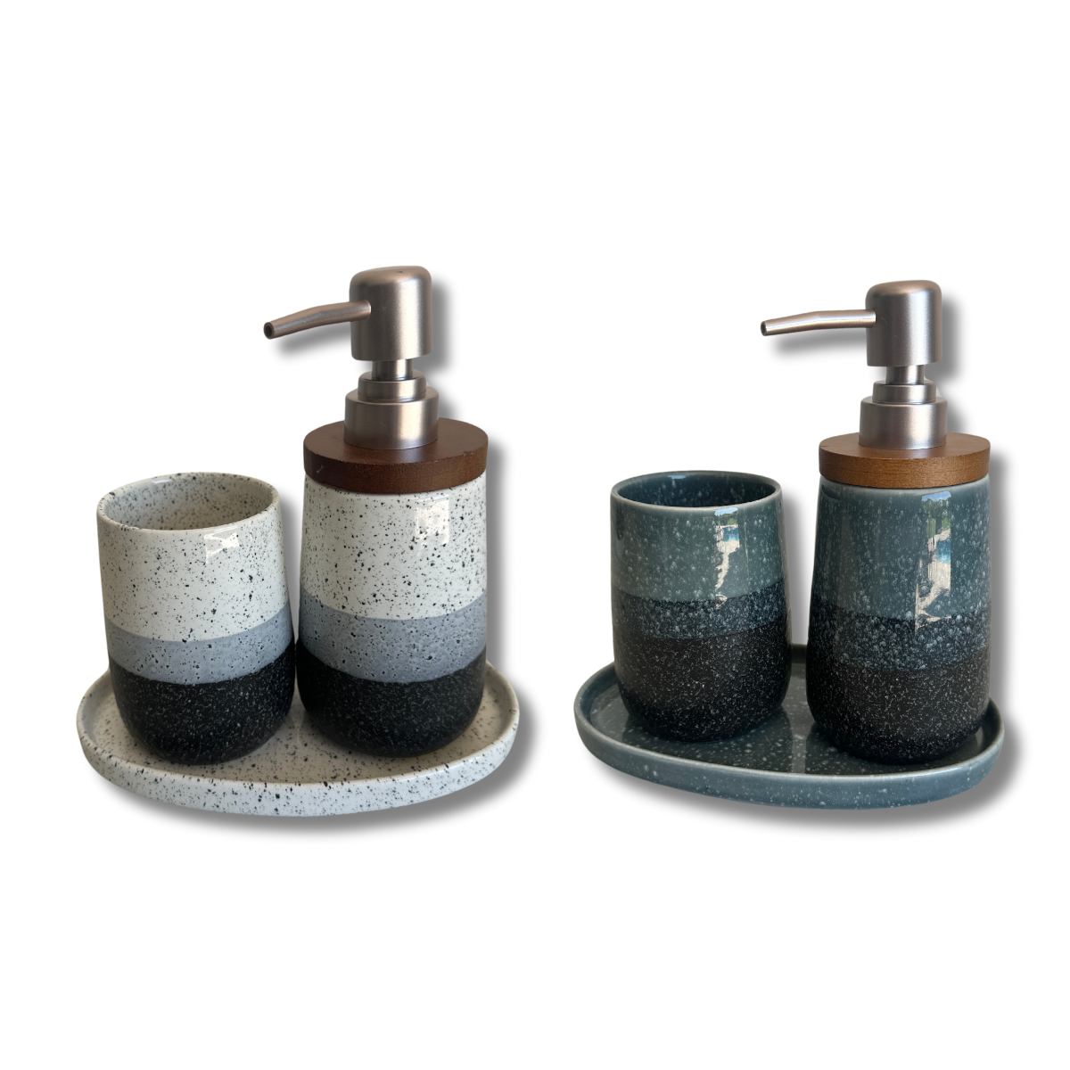 Renueva tu baño con este juego de accesorios de baño de 3 piezas, fabricado en cerámica de alta calidad y disponible en dos elegantes colores. Este set, con un diseño cónico que agrega un toque moderno, incluye un vaso, un recipiente para jabón líquido y un plato. Su combinación de colores y materiales naturales lo convierte en el complemento perfecto para aquellos que buscan estilo y funcionalidad en su baño.